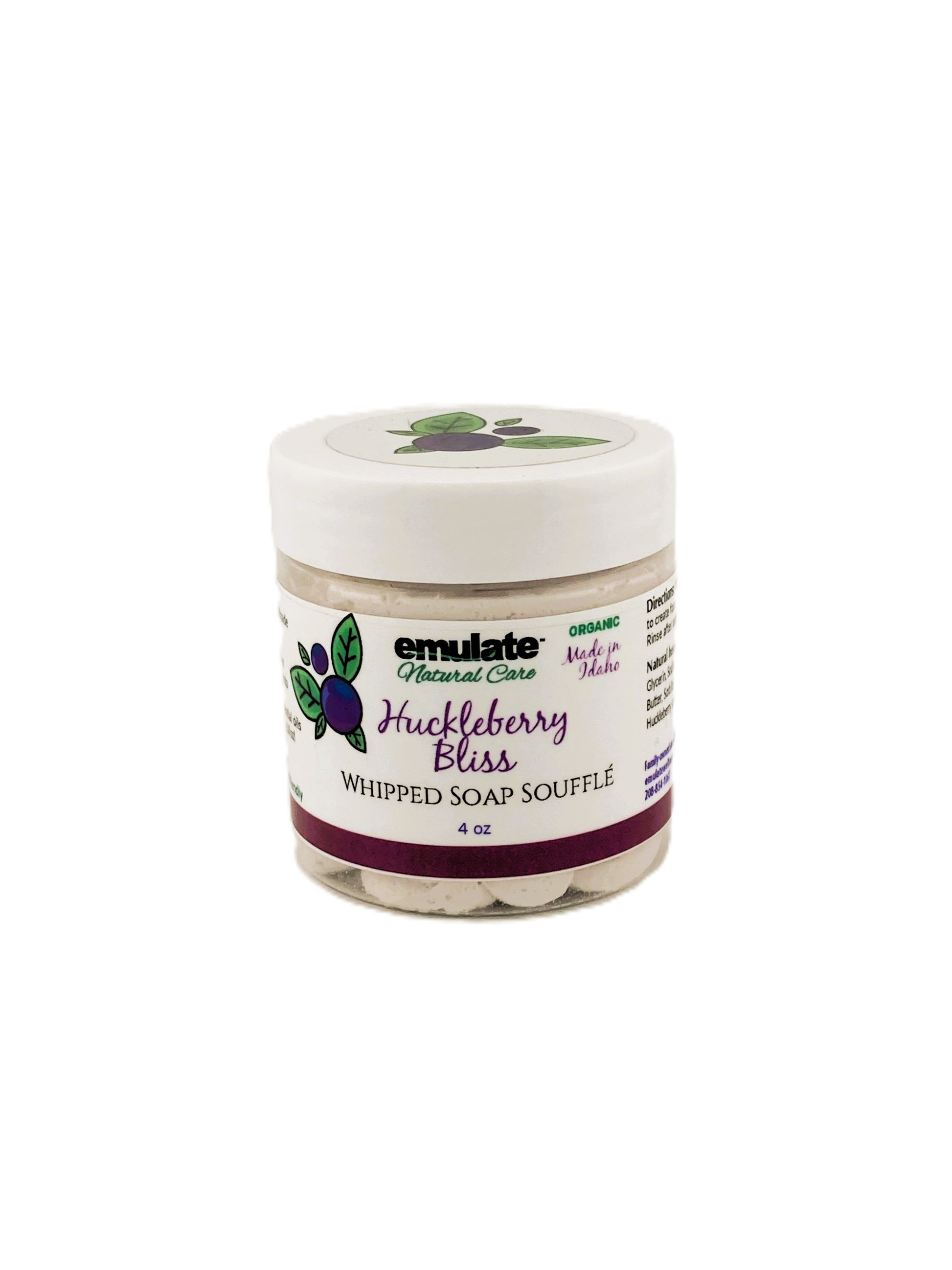 Idaho is famous for its wild Huckleberries, and this handmade whipped soapy soufflé is the ultimate Huckleberry treatment for bath or shower! This light fluffy soap glides onto skin and moisturizes with organic Shea Butter and essential oils for a feeling of sheer Huckleberry Bliss!